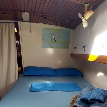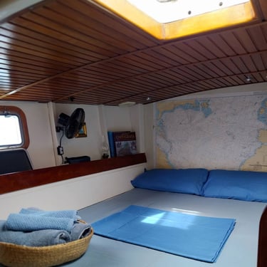 Su interior es muy fresco y luminoso, los camarotes y las zonas comunes tienen muchas ventanas que permiten una visión completa de nuestro entorno por las que circula el aire y la luz natural. Hay ventiladores en todos los espacios. Todo ha sido decorado con mucho cariño.