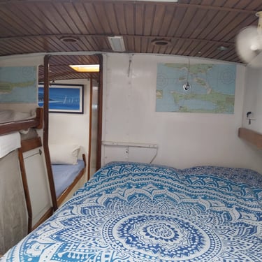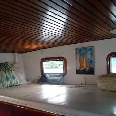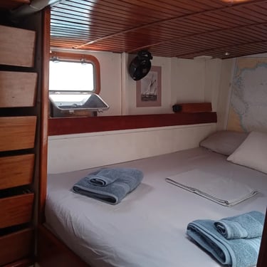 The interior of the Tintamare is designed to be fresh and luminous, with plenty of windows that offer sweeping views of the surrounding sea. These windows allow for natural light and fresh air to flow freely throughout the space. Each area, from the cabins to the common spaces, is equipped with fans for added comfort, and everything aboard has been lovingly decorated to create a cozy, inviting atmosphere.